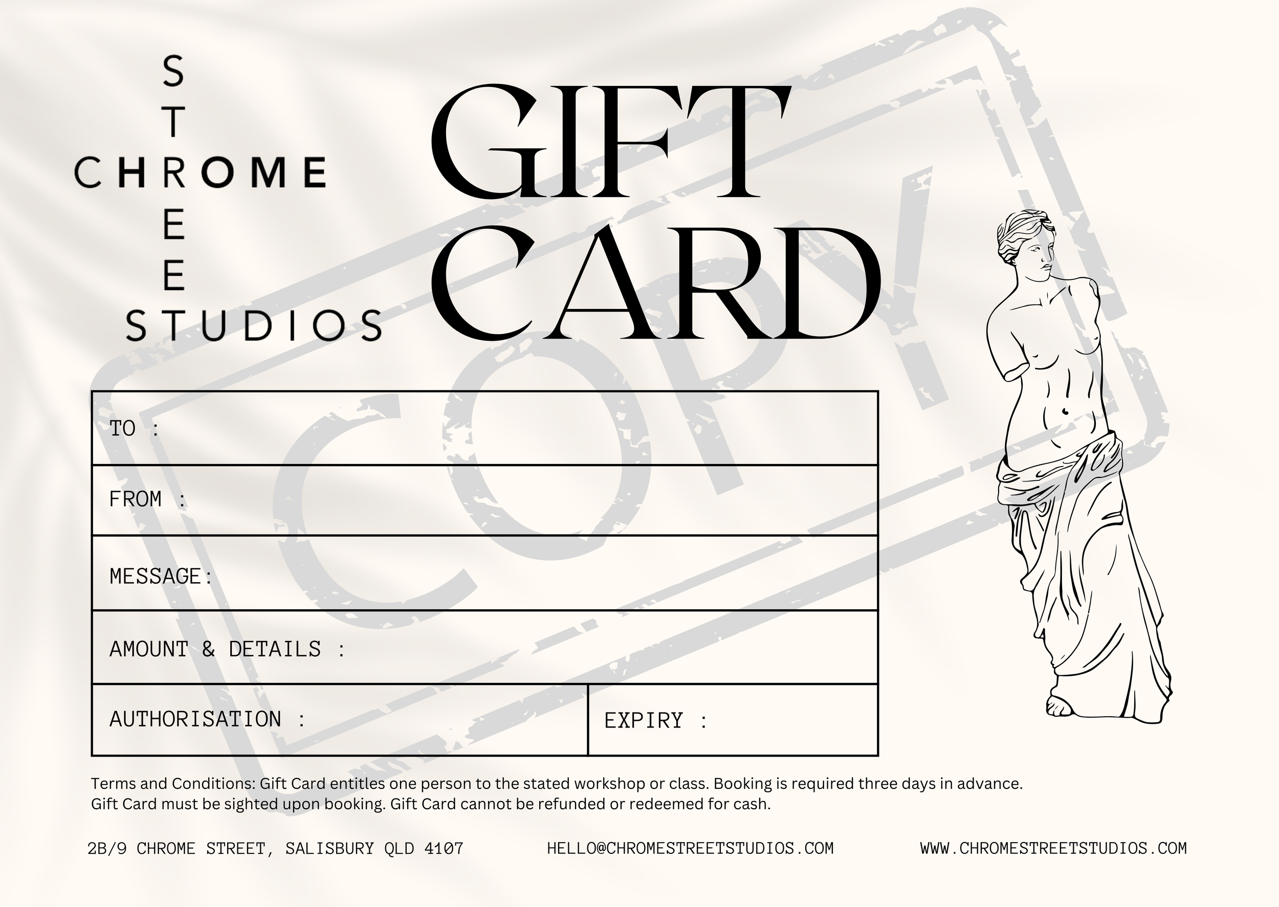 Gift cards can be physical gift cards (pick-up from our studio or $1.50 postage to billing address available), or digital gift cards emailed to your email address.